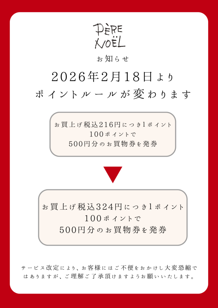ポイントルール変更のお知らせ 2026.02.16 お知らせ 平素より当店をご利用いただき、誠にありがとうございます。このたび、原材料費や物流費の高騰に伴い、現行のポイント還元率を維持することが難しくなったため、2026年2月18日より還元率を変更させていただくこととなりました。 今まで貯めていただいた所持ポイントは、据え置きとなります。 お客様にはご不便をおかけいたしますが、今後も品質とサービスの維持・向上に努めてまいります。何卒ご理解賜りますようお願い申し上げます。